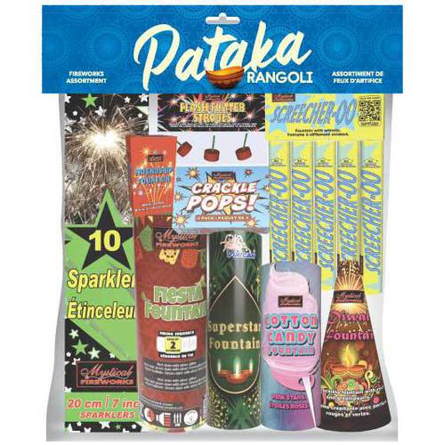 Contains: Friendship Fountain, Cotton Candy Fountain, Diwali Fountain, Fiesta Fountain, Superstar Fountain, Screecheroos (5 pack), Crackle Pops! (4 pack), 20cm (7″) Sparklers, Flash Flitter Strobes.
