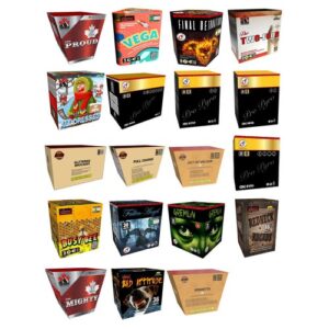 Large assortment of multishot cakes: Act of Valour, Vendetta, Glittering Brocades, Bad Attitude, The Proud, Full Charge, CDC-9797, CDC-9898, CDC-9494, CDC-9191. Fallen Angel, Gremlin, The Two-Four, All Dressed, Final Detonation, Redneck Ruckus, The Mighty, Busy Bee, Vega.